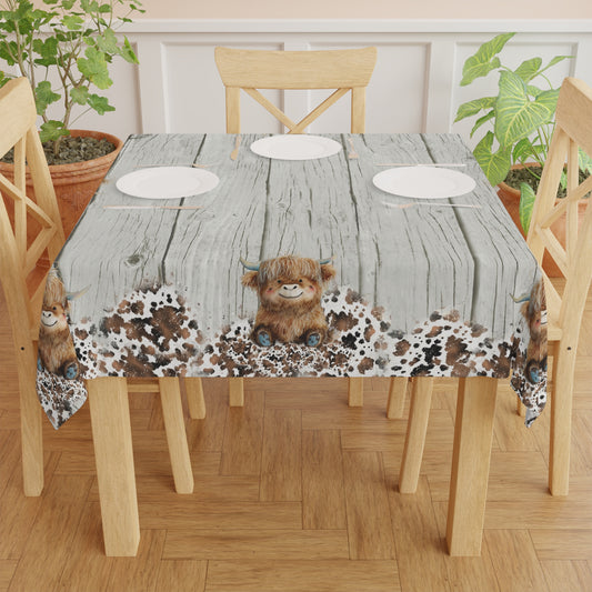 Rustic Farmhouse Tablecloth | Highland Cow Woodprint Table Cover | Cow Themed Home Decor | "Highland Munchies"