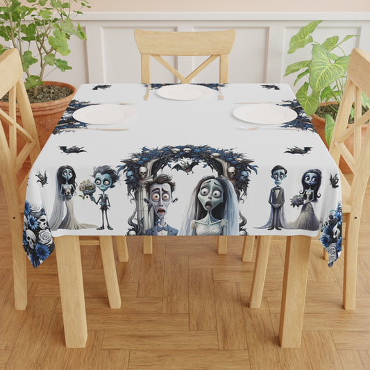 Goth Cartoon Married Couple Tablecloth | Zombie Wedding in the Woods Table Cover | Cartoon Horror Themed Home Decor | "Undead & Wedded"