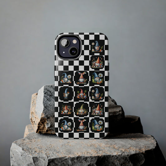 Check Pattern Easter Tough iPhone Case | Spring Easter Gnomes Phone Cover | Gnome Themed iPhone Accessories | "Springtime Check Gnomies"