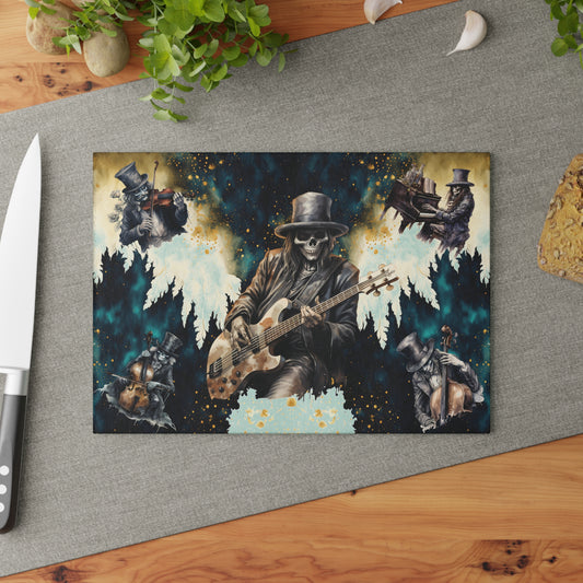 Skeleton Rock Band Glass Cutting Board | Ghostly Music Kitchen Decor | Rock & Roll Death Themed Home Accents | "Music Man"