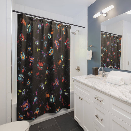 Scary Cartoon Style Cat Shower Curtain | Spooky Kitties Bathroom | Cat Art Themed Bath Decor | "Feline Combine"