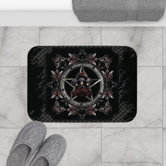 Dark Gothic Steampunk Bath Mat | Steel Metal Roses Butterflies Bathroom Rug | Dark Goth Themed Bath Decor | "Heavy Metal"