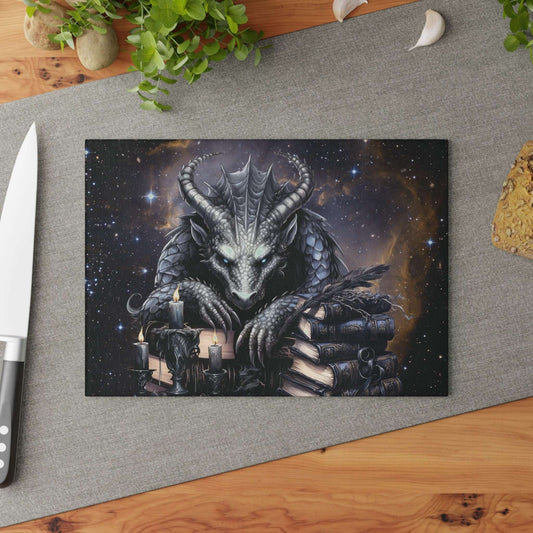 Ethereal Fantasy Style Glass Cutting Board | Black Gargoyle Starry Sky Kitchen Decor | Supernatural Themed Home Accents | "Knowledge is Power"