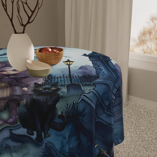 Dark Spooky Tablecloth | Witch Cemetery Black Cat Table Cover | Dark Scary Themed Home Decor | "Witch Amongst the Dead"