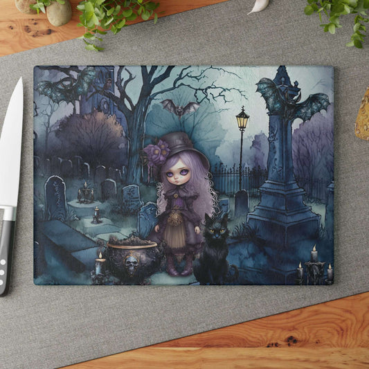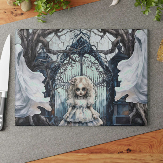 Spooky Gothic Glass Cutting Board | Ghosts Cemetery Scary Little Girl Kitchen Decor | Dark Scary Themed Home Accents | "Let's Play"