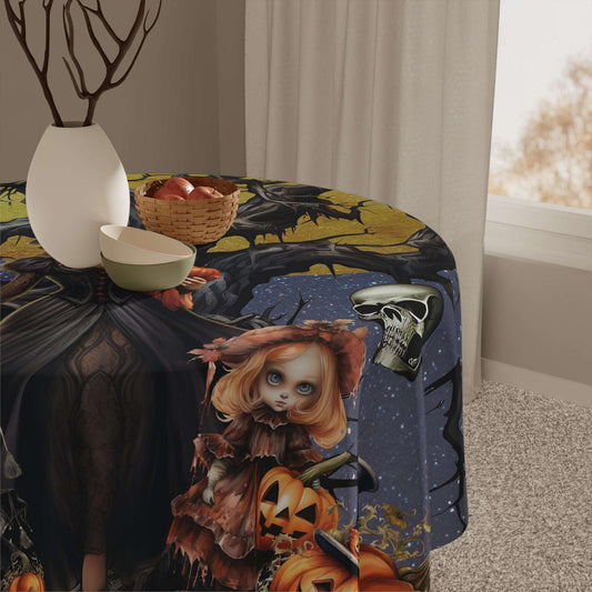 Autumn Fall Gothic Tablecloth | Witch Cemetery Skulls Little Girl Table Cover | Dark Scary Themed Home Decor | "Autumn Moon"