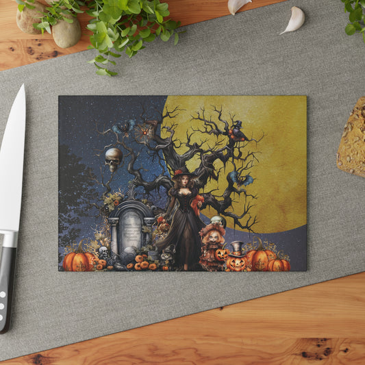Autumn Fall Gothic Glass Cutting Board | Witch Cemetery Skulls Little Girl Kitchen Decor | Dark Scary Themed Home Accents | "Autumn Moon"
