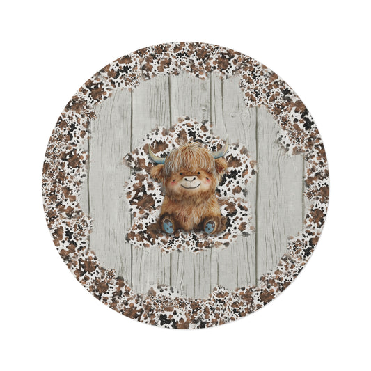 Rustic Farmhouse Round Accent Rug | Highland Cow Woodprint Area Rug | Cow Themed Home Decor | "Highland Grounds"