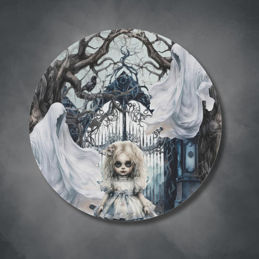 Spooky Gothic Round Accent Rug | Ghosts Cemetery Scary Little Girl Area Rug | Dark Scary Themed Home Decor | "Let's Play"