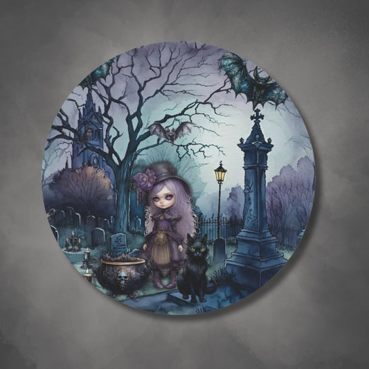 Dark Spooky Round Accent Rug | Witch Cemetery Black Cat Area Rug | Dark Scary Themed Home Decor | "Witch Amongst the Dead"