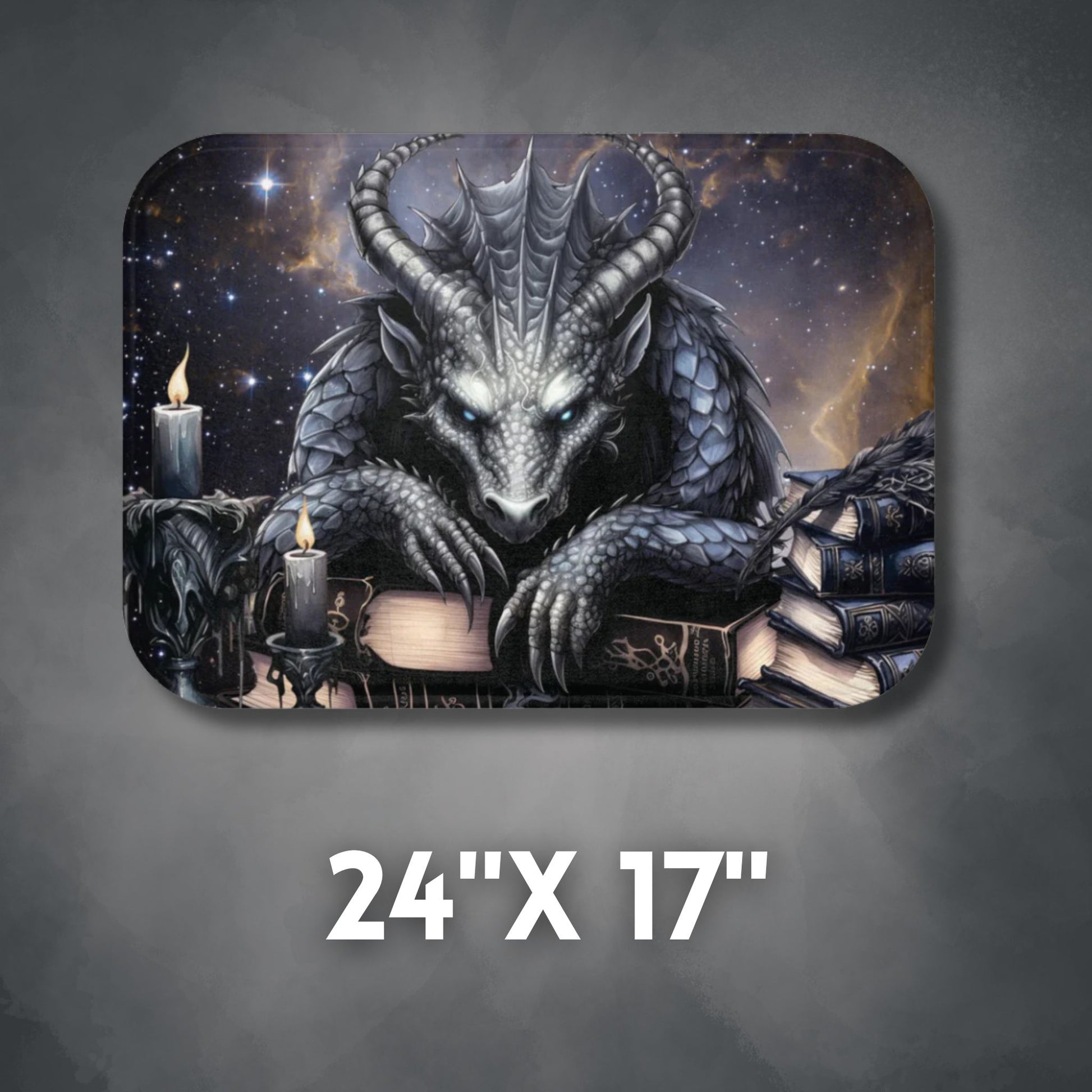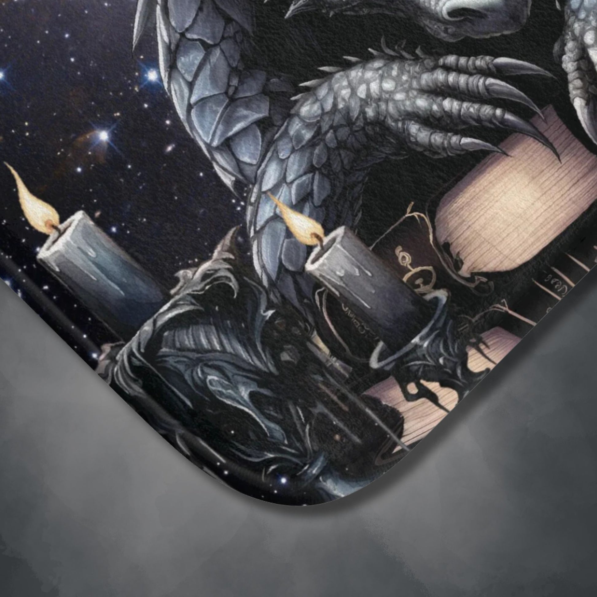 Indulge in a unique and stylish decor in your most private space with this soft, luxurious, and beautiful bath mat! Its intricate design features a black Gargoyle set against a starry sky, ethereal space dust, and a stack of books -- a bold reminder of ancient mythologies and cultures where knowledge and power reign. Dare to take risks and embrace the challenge of building a world of your own with this inspiring piece of supernatural-inspired bath decor.