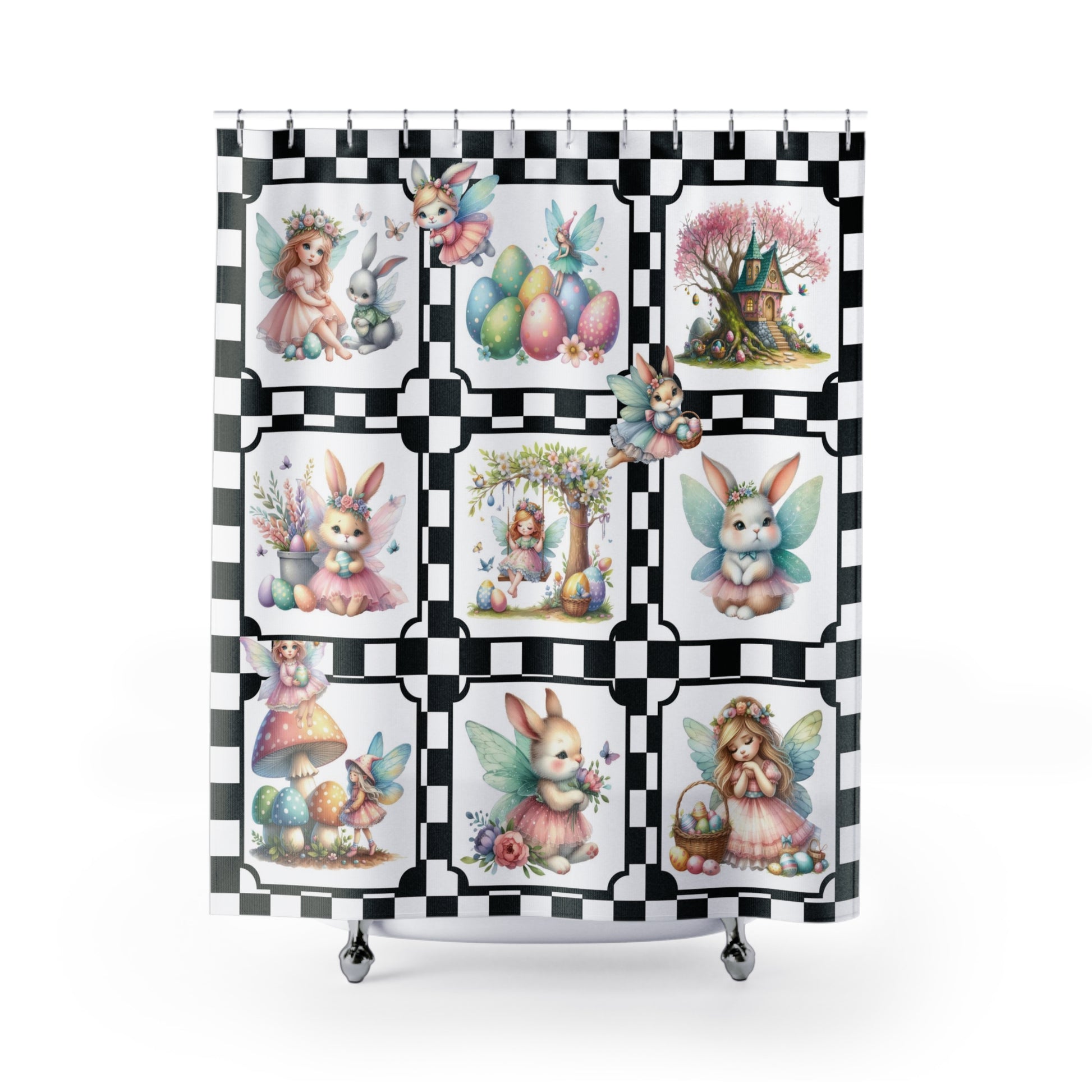 Transform your bathroom into a whimsical wonderland with our Gingham Check Spring Easter Shower Curtain. Featuring an elegant black and white background, this curtain is adorned with charming Easter-themed images of bunnies, fairies, and colorful eggs. Elevate your bath decor with a touch of farmhouse fairy style.